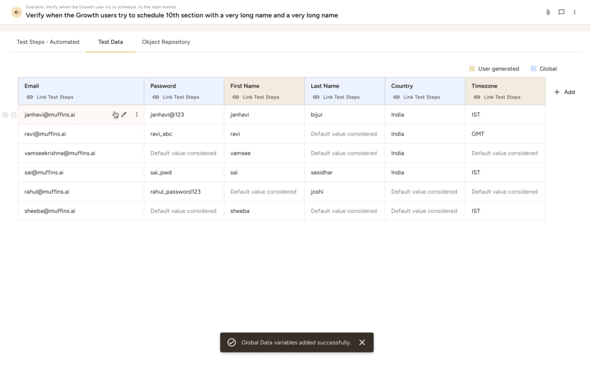 - Centralized Global Data Management: This allows teams to store test data in one location and reuse it across test suites – ensuring consistency and easier maintenance. Currently supporting static data (e.g., CSV files), Muffins has the roadmap for integrating dynamic data sources like databases & spreadsheets, which are ideal for enterprises managing complex test configurations across staging, production and client-specific environments.