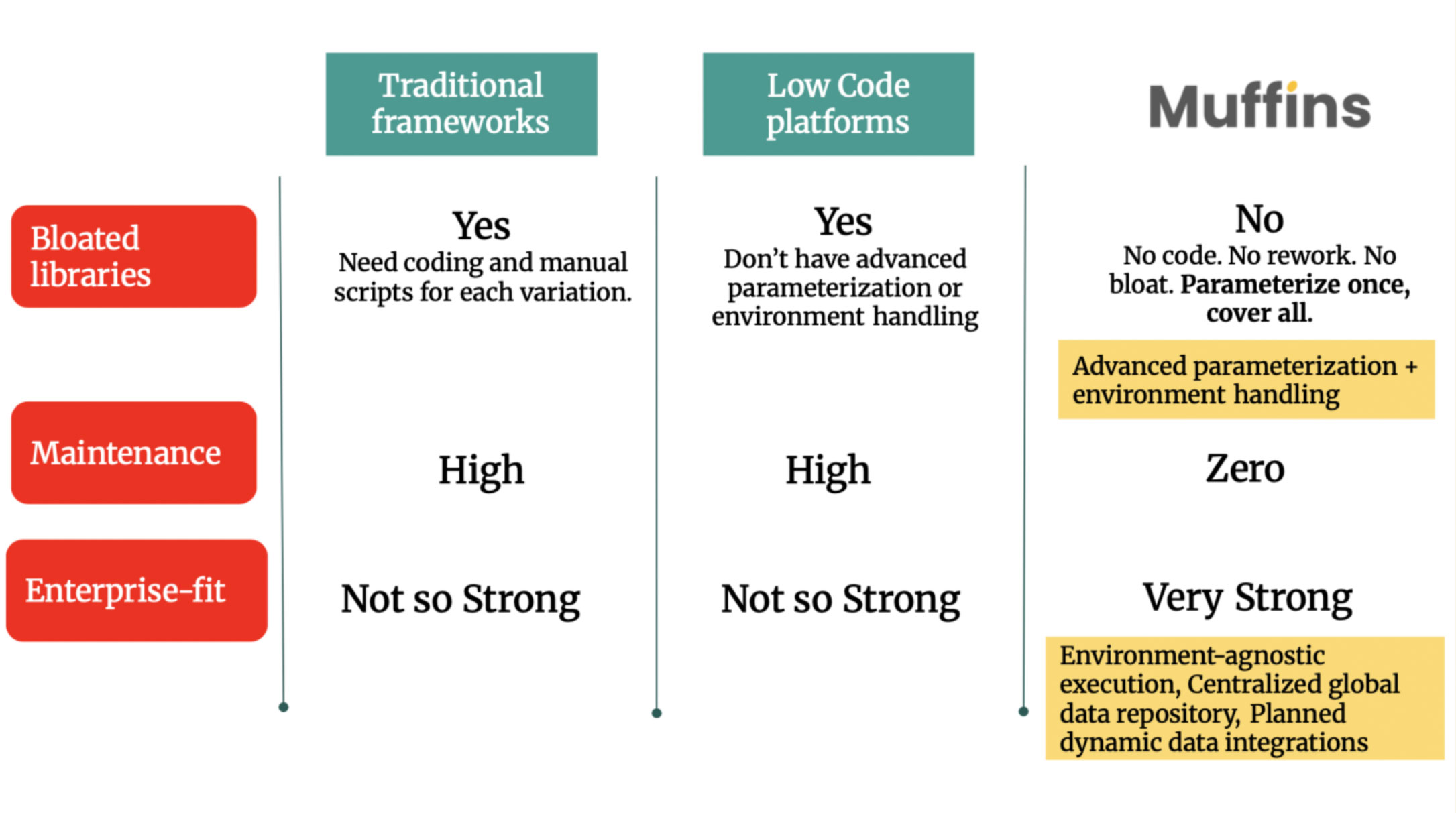 Take a Monday release where you need to validate a login flow across 5 environments (Dev, QA, staging, Product, Sandbox), 3 user types (admin, guest, premium), and 3 browsers (Chrome, Firefox, Safari). In a traditional setup, this demands 45 individual scripts—each manually created, updated, and debugged. A single UI change, like a new login field, could mean hours of rework, while a typo in one script might silently slip a flawed test into production. Muffins eliminates this chaos through parameterization.